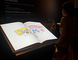 透過光雕書本投影介紹清法戰爭兩方的軍備知識,體驗者必須使用手勢來翻書。
